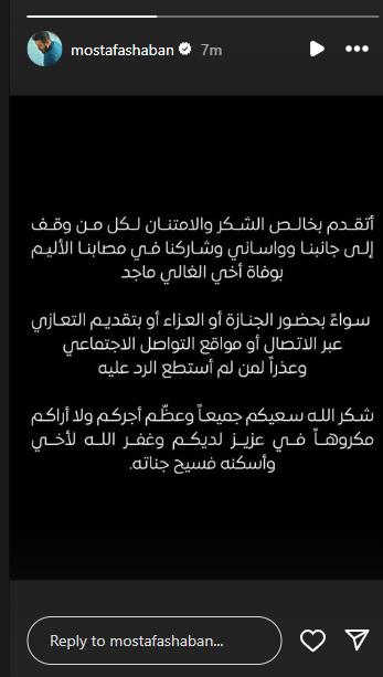 وكتب مصطفى شعبان: “أتقدم بخالص الشكر والامتنان لكل من وقف إلى جانبنا وواساني وشاركنا في مصابنا الأليم بوفاة أخى الغالي ماجد سواء بحضور الجنازة أو العزاء أو بتقديم التعازي عبر الاتصال أو مواقع التواصل الإجتماعي وعذرا لمن لم استطع الرد عليه، شكر الله سعيكم جميعا وعظم أجركم ولا أراكم مكروها في عزيز لديكم وغفر الله لأخي واسكنه فسيح جناته”.