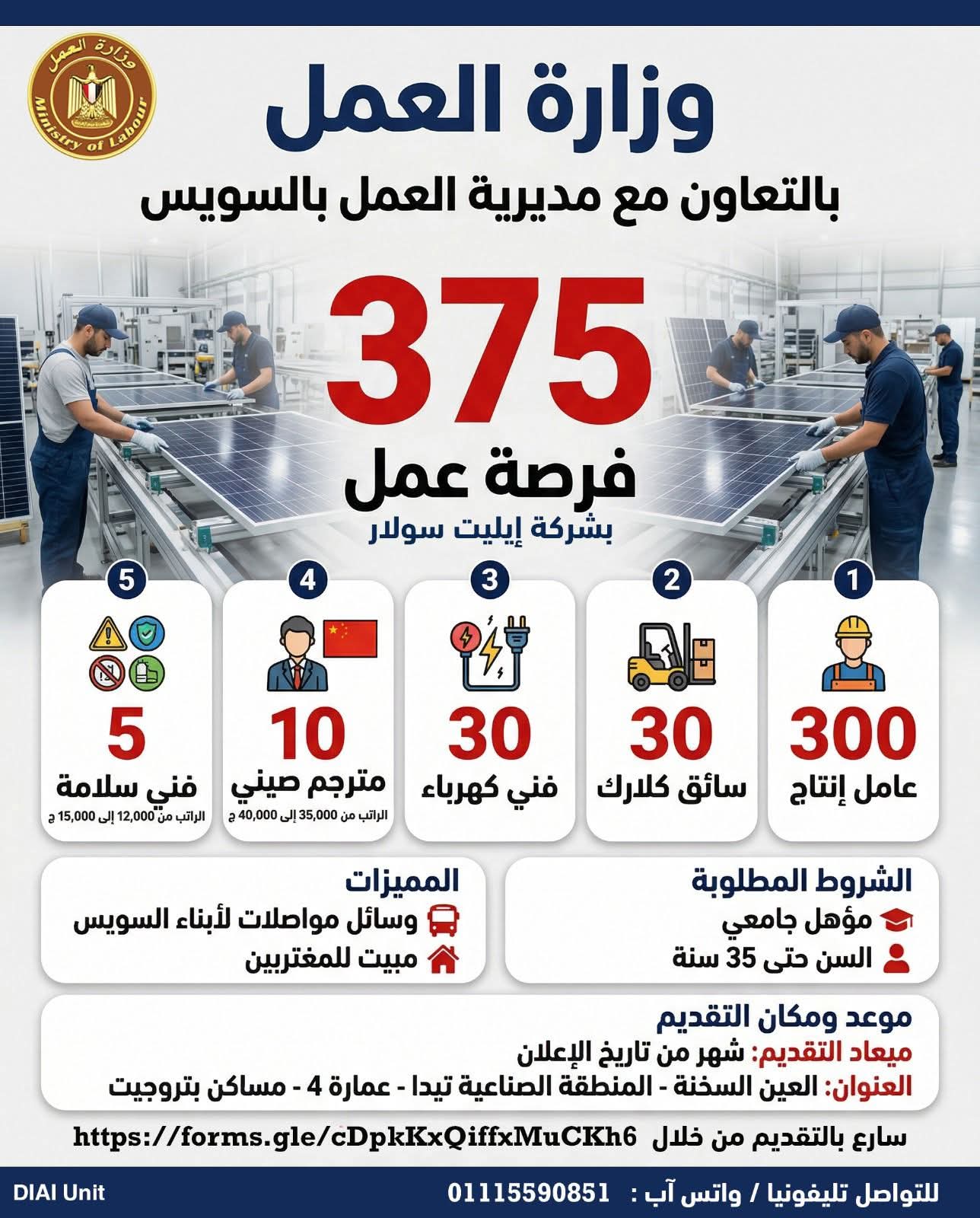 تعلن مديرية العمل بمحافظة السويس بالتنسيق مع الإدارة العامة للتشغيل بالوزارة ، وبالتعاون مع شركة “إيليت سولار” لتصنيع ألواح الطاقة الشمسية (المنطقة الصينية “تيدا” بالعين السخنة)، عن فتح باب التقديم لشغل 375 فرصة عمل في تخصصات متنوعة، وذلك تنفيذاً لتوجيهات معالي وزير العمل حسن رداد، وضمن مبادرة “التشغيل التكاملي” لربط الشباب بفرص العمل الحقيقية وتقليل معدلات البطالة.